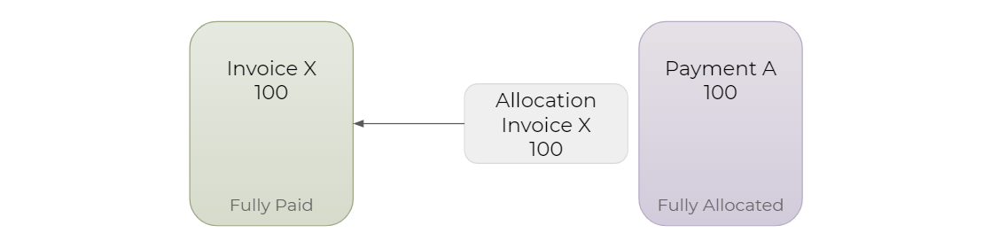 We have the Booking/Invoice X for 100, a Payment A for 100, and an Allocation saying that "100 of Payment A is allocated to Invoice X".